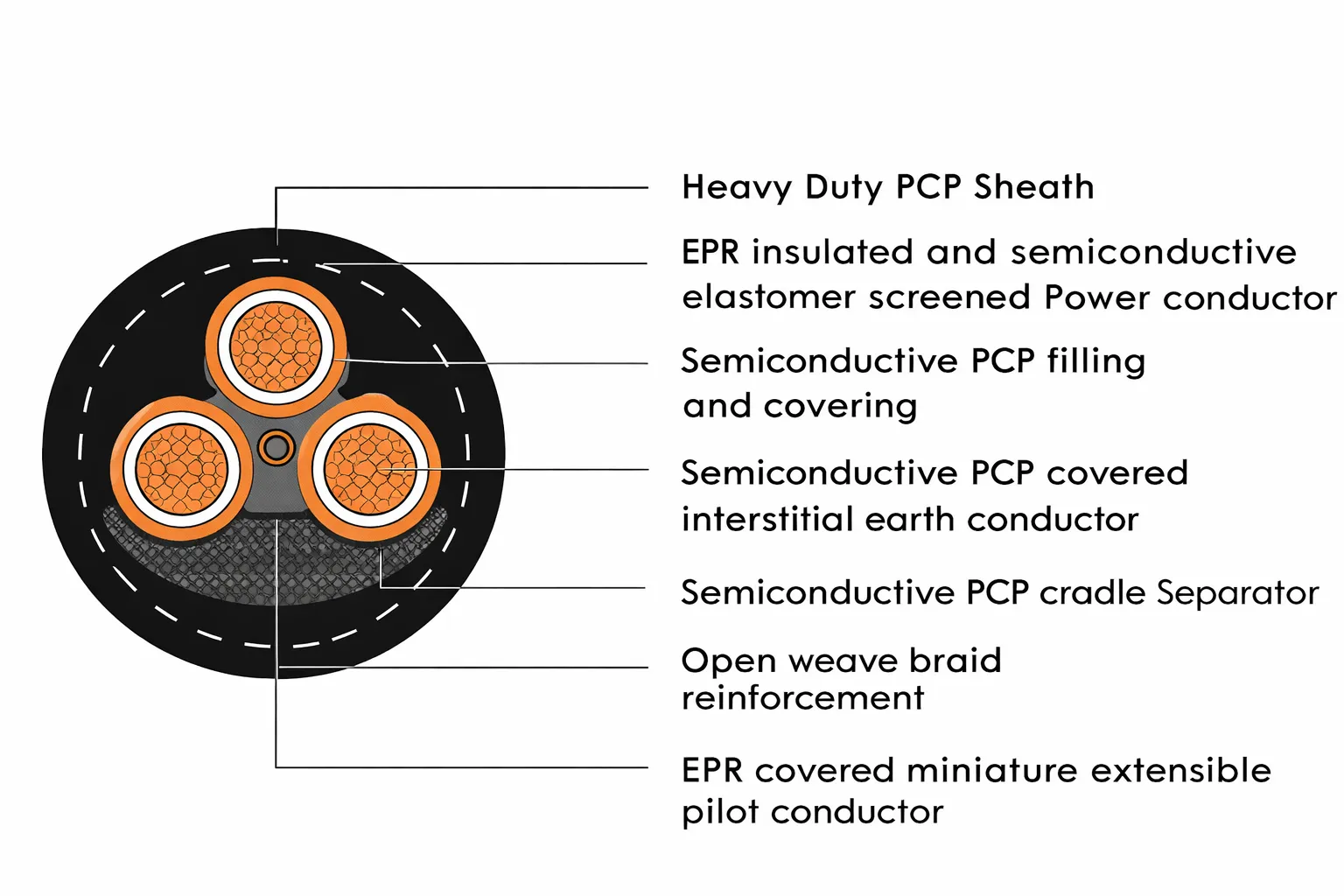1.1/1.1 kV to 11/11 kV general purpose cable used for continuous miners, or feeder cables to pumps. Also commonly used for monorails supplying DCBs and longwalls. Typically, a more flexible cable for use is a semiconductive screen instead of a metal screen.