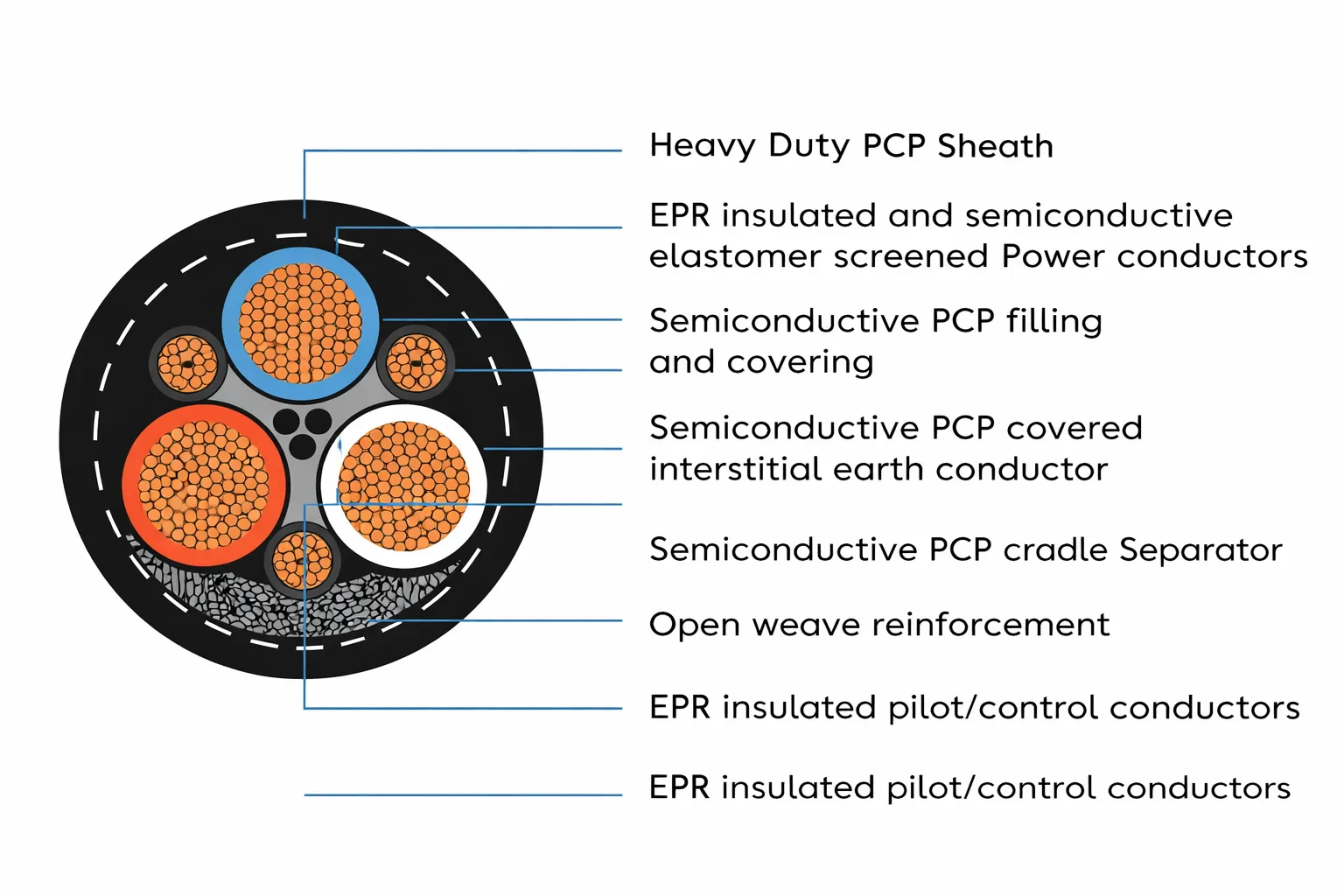 Semiconductive screened power cores, with three earth cores and three extensible pilots.